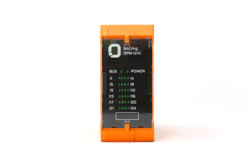 In einem Schaltschrank untergebracht stellt das wartungsfreie I/O-Modul DPM-I24C 24 digitale Eingänge mit 24V Logik zur Verfügung. Die Kommunikation mit dem Gesamtsystem findet über das BACring-Busprotokoll statt. LEDs informieren übersichtlich über Stromversorgung (Power), Busaktivität sowie einzeln über die Eingänge I1 – I24.